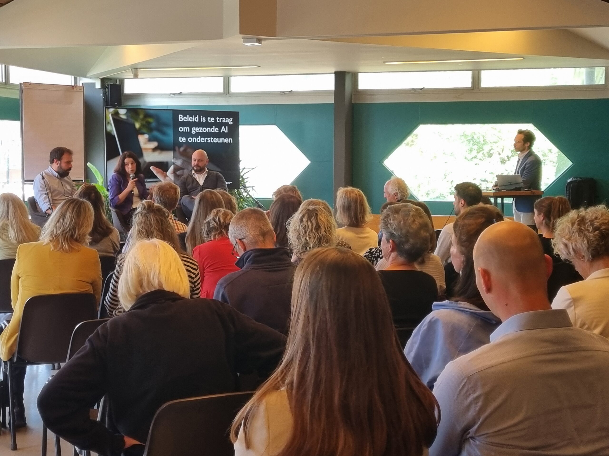 In het panelgesprek gingen de drie panelleden Wouter van der Torre (Onderzoeker TNO), Annemarie Koks (Cluster coördinator SZW) en Tim Goudriaan (AI Advies & Training) met elkaar en het publiek in gesprek aan de hand van drie scherpe stellingen.