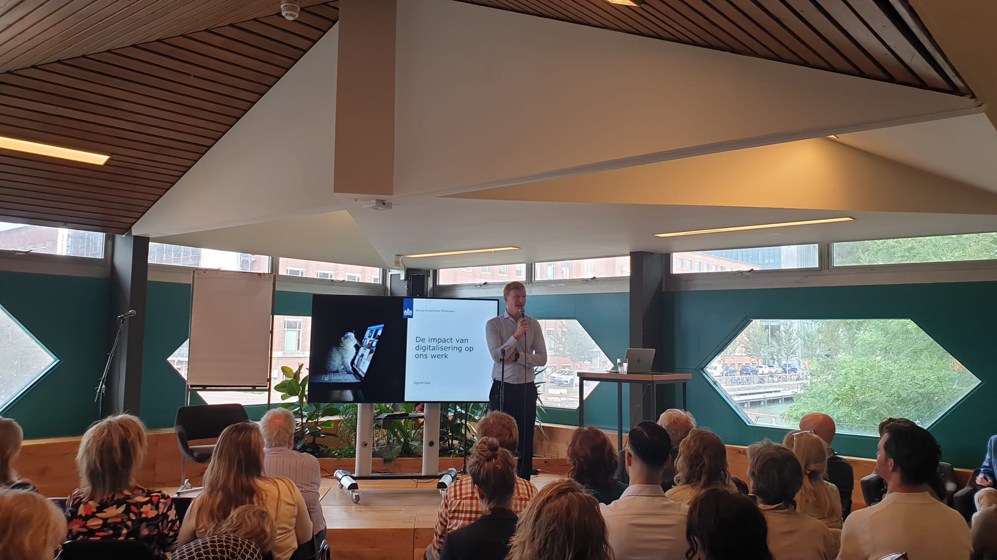 De bijeenkomst werd geopend met een plenaire lezing door Djurre Das van het Sociaal Cultureel Planbureau. Djurre besprak de relatie tussen digitalisering en arbeid en algoritmisch management. Ongeveer 90% van de werkenden gebruikt technologie op de werkvloer. Het gebruik van technologie leidt tot veranderingen in werkprocessen. Waar vroeger gebruik van technologie vooral impact had op de fysieke belasting van werkenden, heeft technologie tegenwoordig ook veel impact op de sociaal-psychologische werkbelasting. Technostress neemt toe door complexiteit en overbelasting.